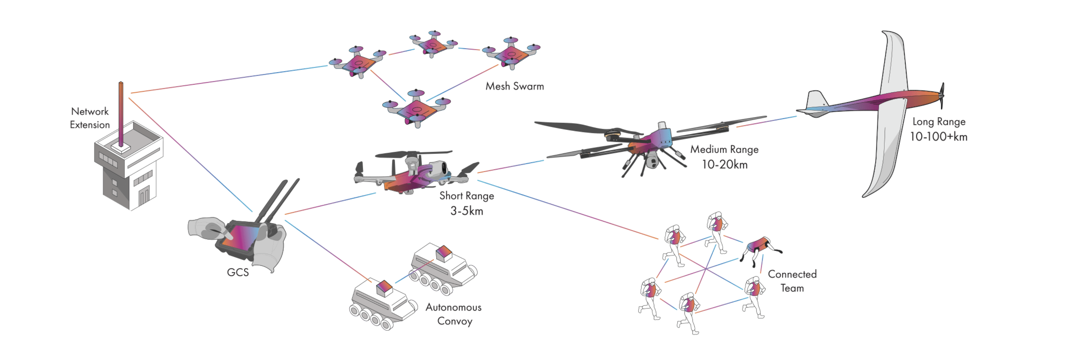 Already battle-hardened, these radios allow for our drones to talk to each other and send data at long distances without relying on delicate cell networks or satellites.